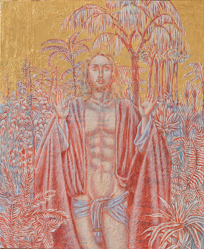 | Un Saint-Antoine garde avec lui précieusement un cactus, signifiant force et renaissance tandis que dans l’autre main, il tient délicatement une fleur de lys, représentant la pureté et la virginité. Dans ses peintures, Jésus dans le désert et Dévotion, un paysage à l’arrière-plan révèle un désir d’un ailleurs, où contempler une végétation luxuriante. Des références à des scènes ou à des figures religieuses se perçoivent dans certaines toiles, tandis que d’autres nous intriguent par leur étrangeté et par la tendresse qui s’en dégagent. |