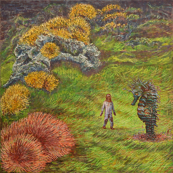 Autour de sa toile Eden, qui réunit anémones, palmiers, végétaux de différents biotopes, animaux et robots, d’autres peintures présentent une densité de plantes et de champignons à la fois étonnants, curieux et suscitant une certaine crainte. Le monde que peint Mauro Bordin semble à la fois familier et étrange, autant fabuleux qu’inquiétant, entre rêve et réalité. S’ils paraissent séduisants, ces paysages denses en végétation, incitent à se poser des questions et annoncent une époque troublée, dans laquelle nous tentons de trouver un sens à nos actions. Ses toiles incitent également à voyager vers des contrées lointaines, en quête d’un certain exotisme. Or, cette recherche n’est-elle pas veine de sens ? Ne pouvons-nous pas retrouver un contact avec une nature plus proche de nous avant de vouloir s’aventurer plus loin ? Telles sont les questions qui émergent en prenant le temps de contempler les peintures de l’artiste. |